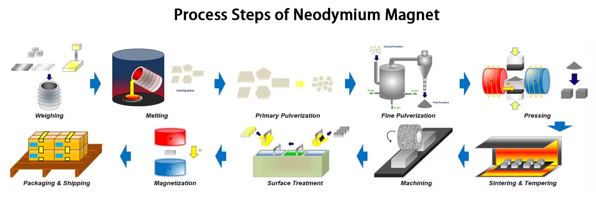 Sintered Neodymium magnets are prepared by melting raw materials in a vacuum or inert gas atmosphere induction furnace, processing them in a strip caster and cooling to form alloy strips. The strips are crushed and ground into fine powder with particle size of microns. The powder is then compacted in an aligning field and sintered into dense blanks. Finally, the blanks are machined into specific shapes, surface treated and magnetized.