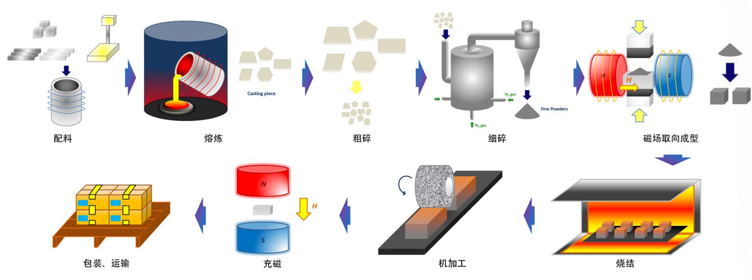 Sintered SmCo magnets are produced through smelting, milling, magnetic field pressing, high-temperature sintering and precision machining.
