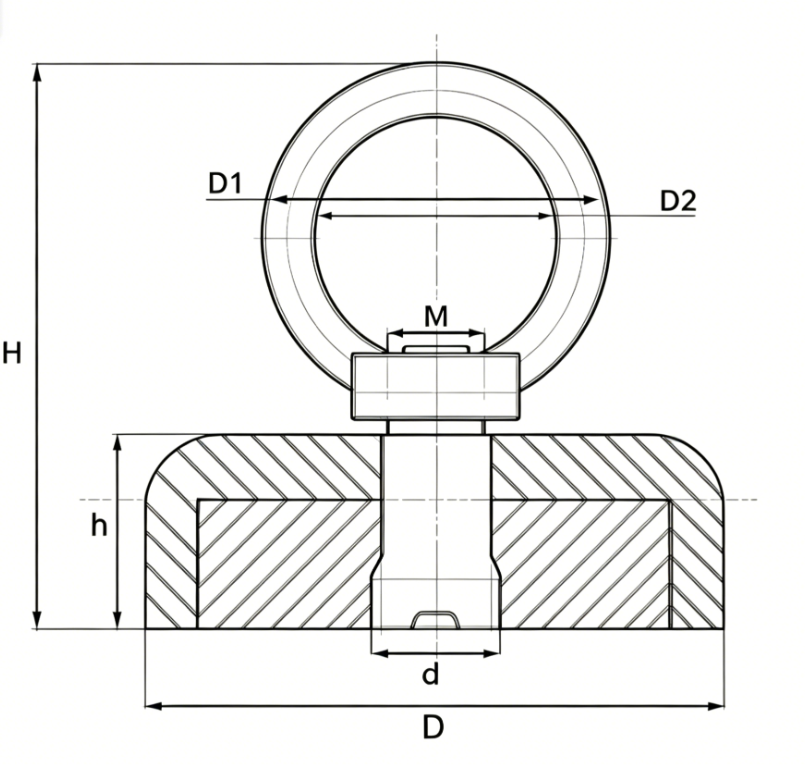 | Model | D(mm) | D1(mm) | D2(mm) | d(mm) | H(mm) | h(mm) | M | Weight(g) | Pull Force(KG) |